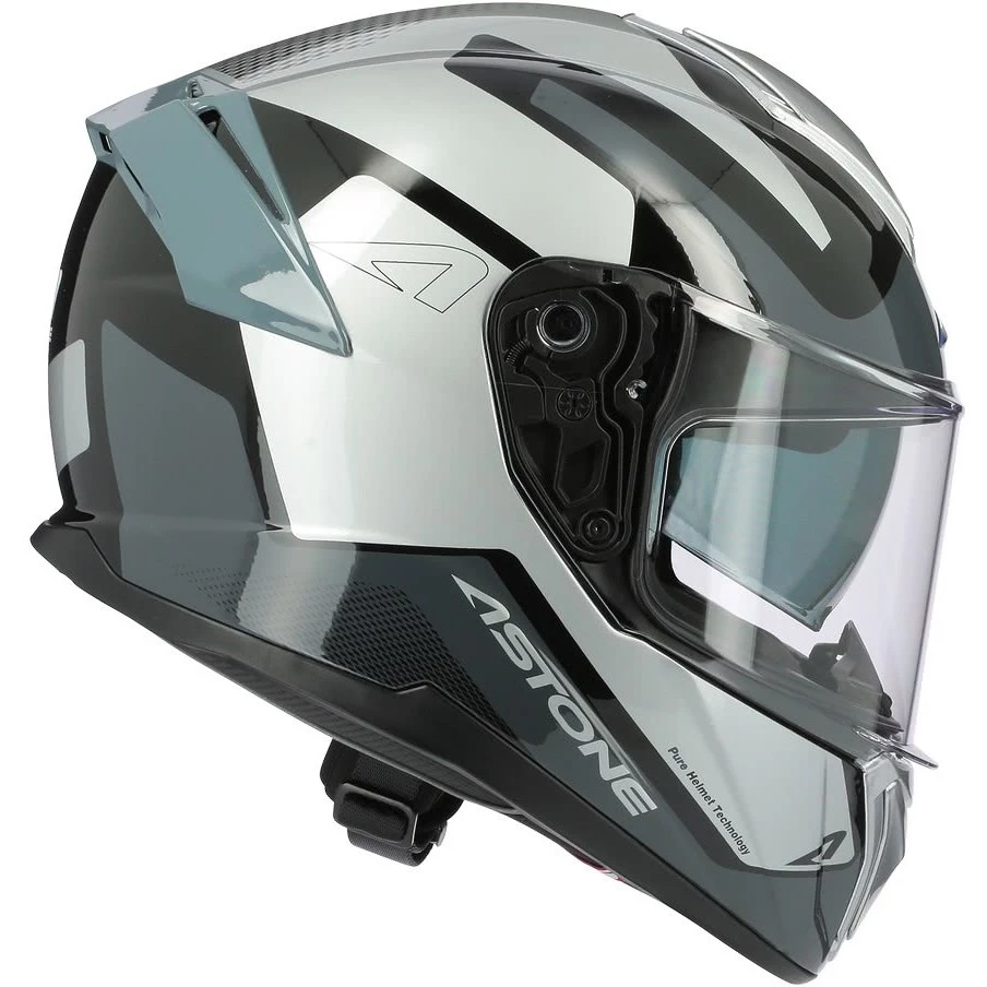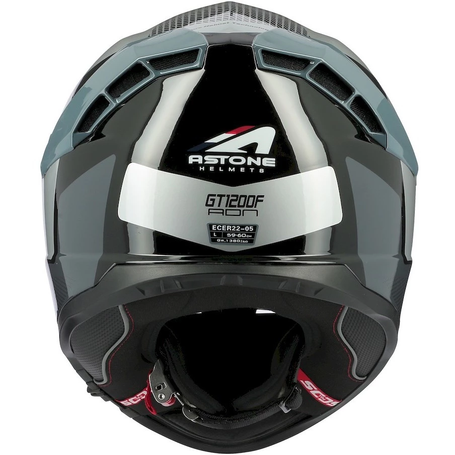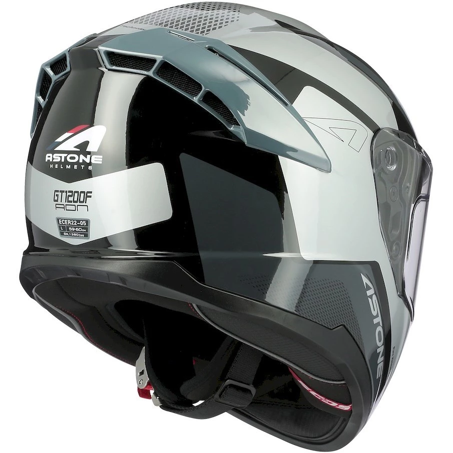 Il casco GT 1200 F è realizzato in fibre tricomposite, con visiera predisposta per pellicola anti-appannamento Pinlock e dotata di schermo parasole retraibile, chisura con cinturino micrometrico