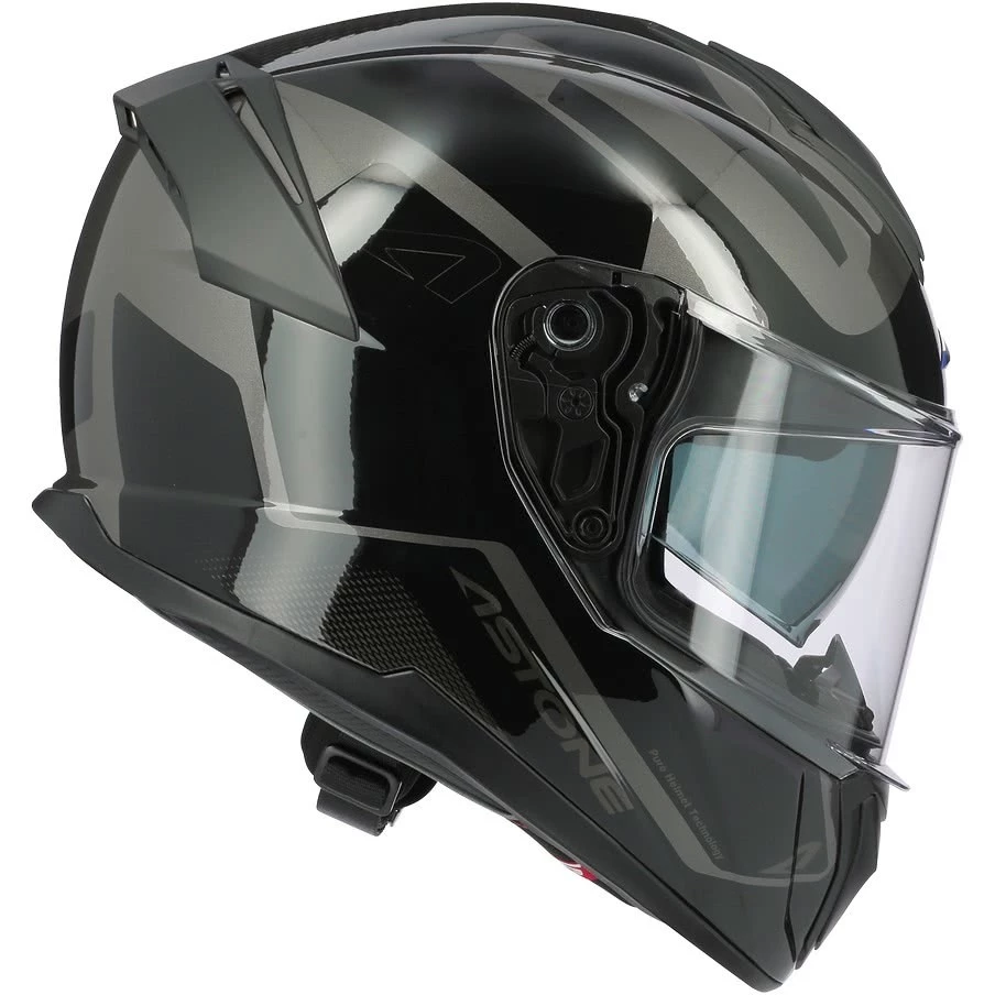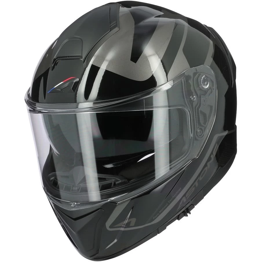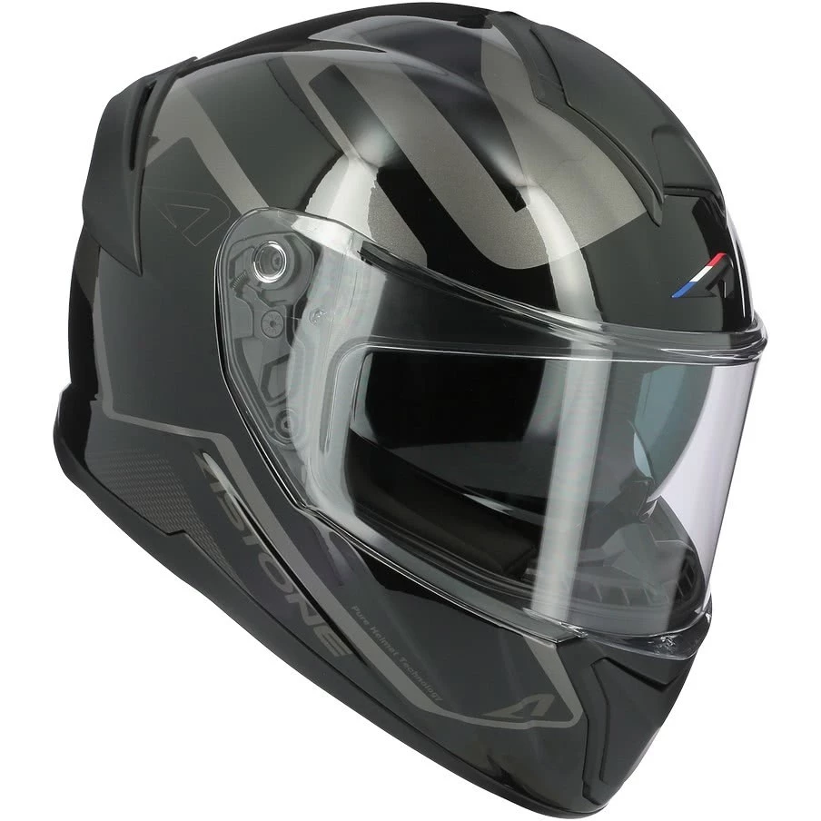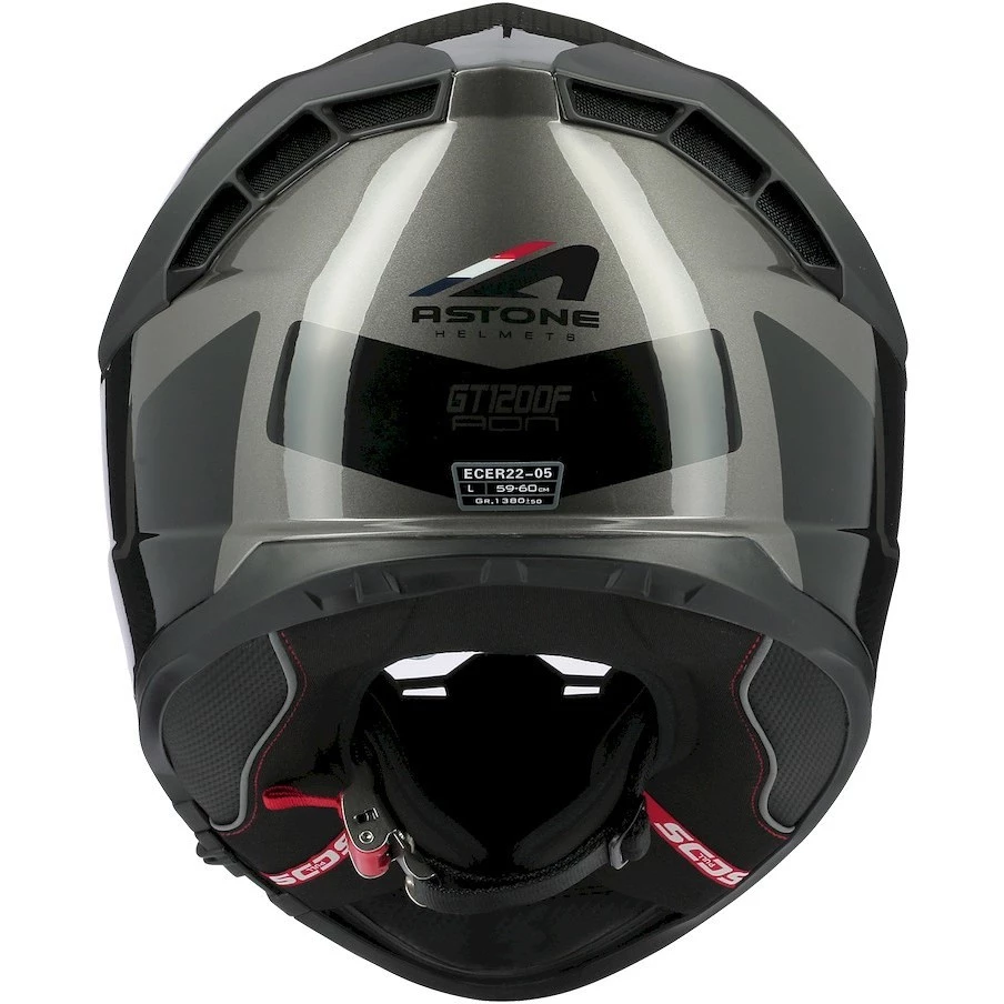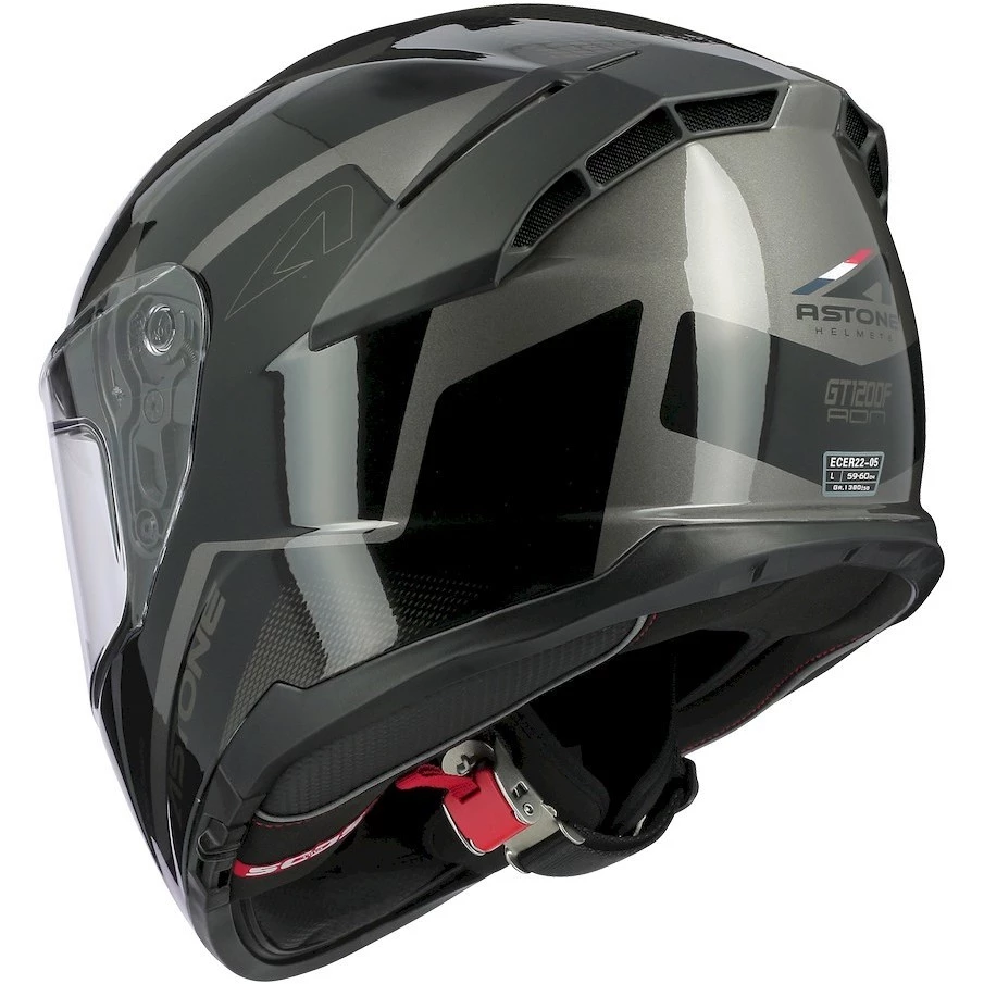 Il casco GT 1200 F è realizzato in fibre tricomposite, con visiera predisposta per pellicola anti-appannamento Pinlock e dotata di schermo parasole retraibile, chisura con cinturino micrometrico