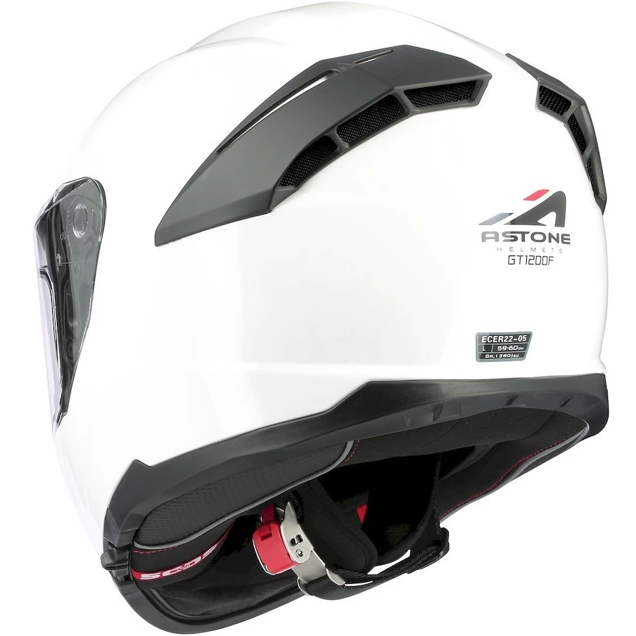 Il casco GT 1200 F è realizzato in fibre tricomposite, con visiera predisposta per pellicola anti-appannamento Pinlock e dotata di schermo parasole retraibile, chisura con cinturino micrometrico